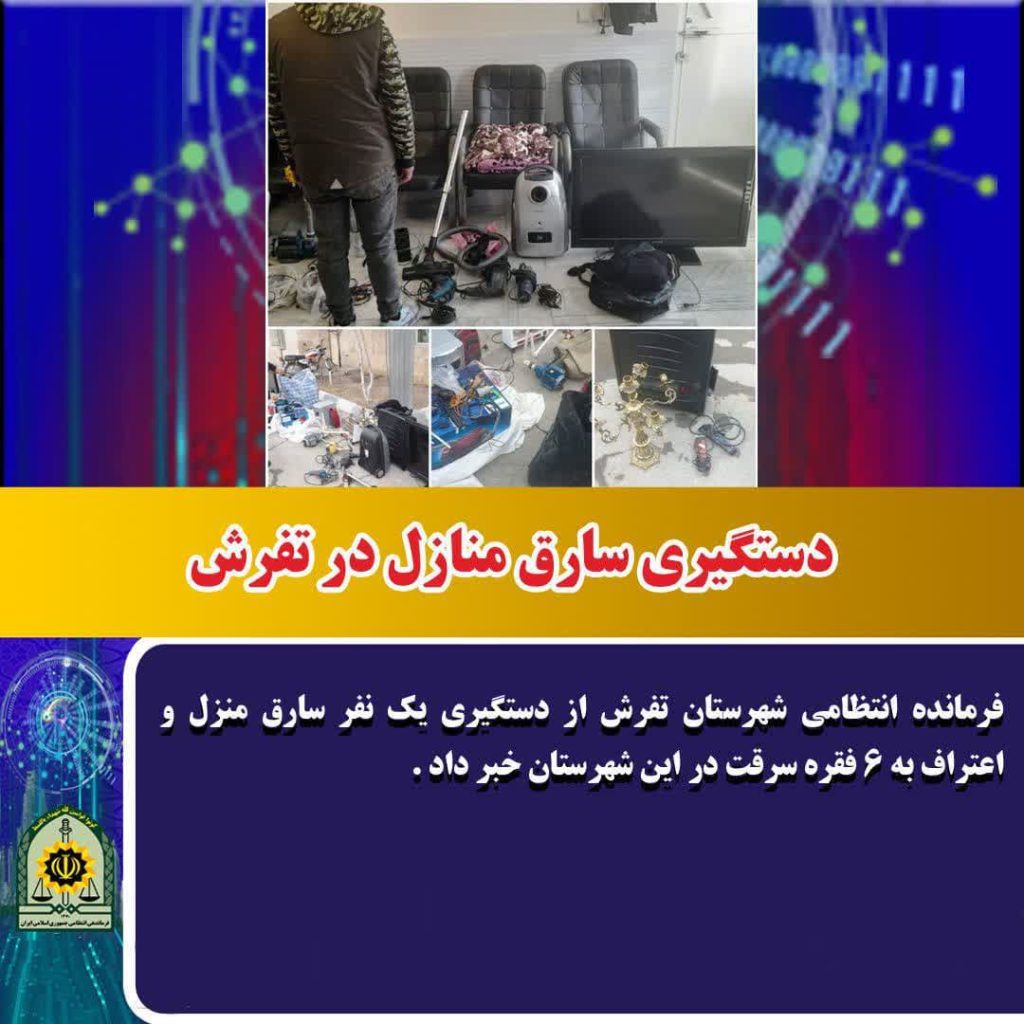 به گزارش پایگاه خبری تحلیلی «ندای تفرش»، به نقل از خبرگزاری پلیس، سرهنگ حسین اسلامی در تشریح این خبر بیان داشت: به دنبال وقوع چند فقره سرقت منزل در یکی از مناطق شهرستان تفرش، مأموران انتظامی کلانتری ۱۱ این شهرستان با کار تخصصی و اقدامات پلیسی یک سارق را در ارتباط با سرقت رخ داده شناسایی و با هماهنگی مرجع قضائی طی عملیاتی غافلگیرانه وی را دستگیر کردند.