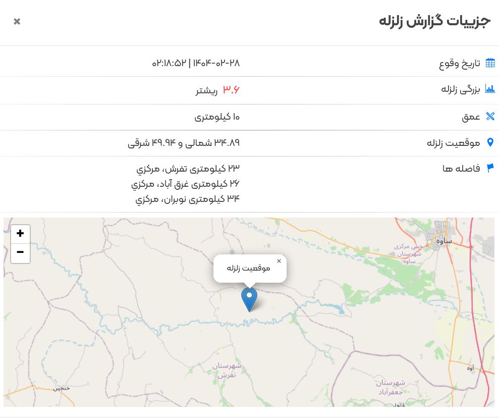 زمین‌لرزه‌ای به بزرگی ۳.۶ ریشتر بامداد یکشنبه ۲۸ اردیبهشت ماه شهر تفرش در استان مرکزی را لرزاند.