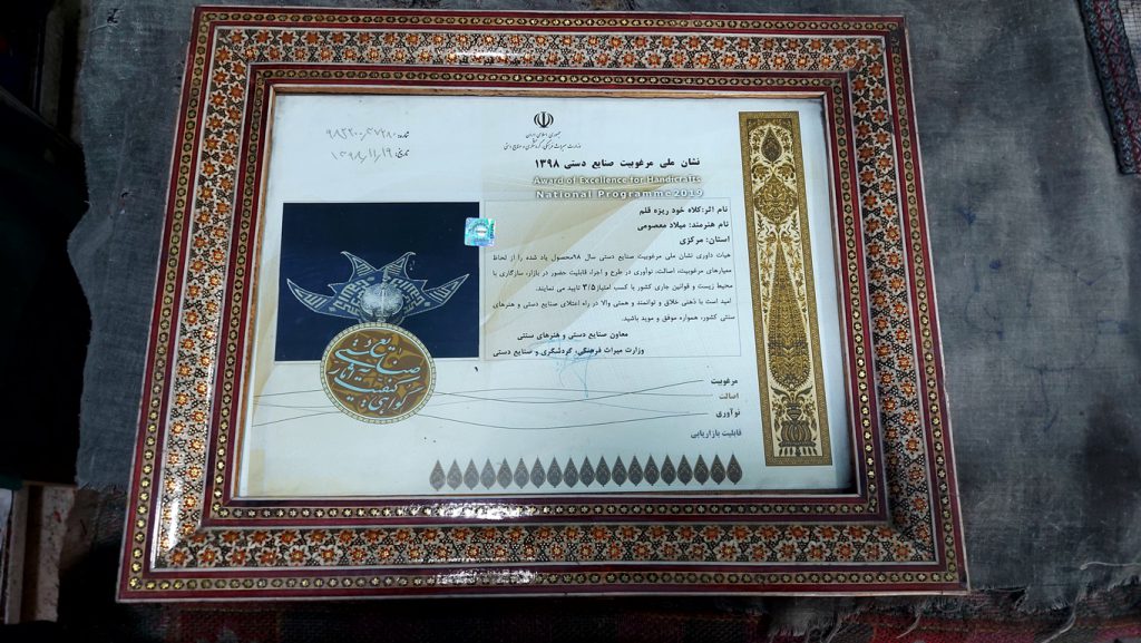 وی در ادامه به دریافت مهر اصالت ملی اشاره و عنوان کرد: هنرمندان در رشتههای مختلف دو سالی یکبار میتوانند یک اثر خاص و تکرارنشدنی را بسازند و به سازمان ارائه کنند، که از طرف سازمان میراث فرهنگی برای دریافت عنوان مهر اصالت ملی معرفی و بین استانها و منطقه رونمایی و داوری میشود، اگر نوآوری، خلاقیت و تازگی در بین آثار باشد به آن اثر مهر اصالت داده میشود.