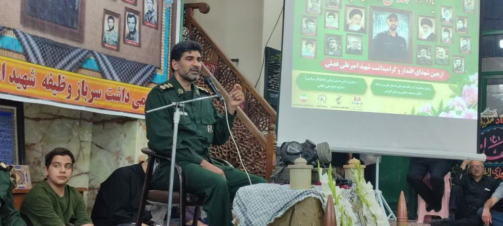 در این یادواره وحید هاشمی فرمانده ناحیه مقاومت بسیج ضمن عرض خیرمقدم خدمت مردم ولایت مدار و خانواده شهدا به ویژه خانواده شهید امیرعلی فضلی رمز پیروزی ایران اسلامی در جنگ تحمیلی آمریکایی و صهیونیستی را انسجام مردم، رهبری داهیانه امام خامنه ای(مدظلهالعالی ) و خون پاک شهدا دانست.