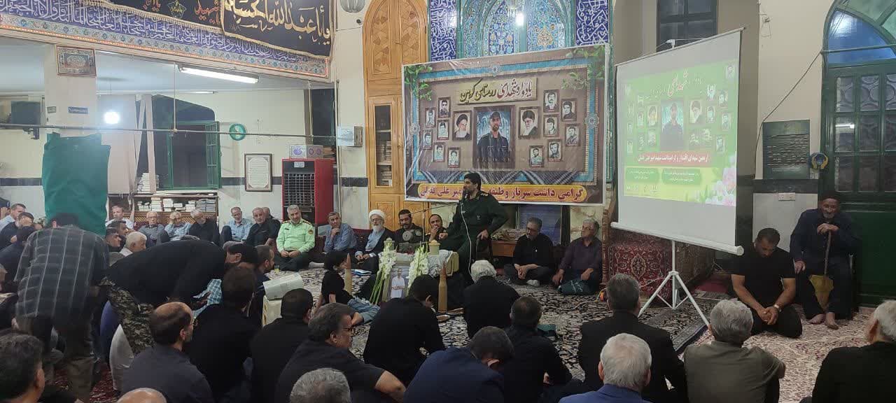 در این یادواره وحید هاشمی فرمانده ناحیه مقاومت بسیج ضمن عرض خیرمقدم خدمت مردم ولایت مدار و خانواده شهدا به ویژه خانواده شهید امیرعلی فضلی رمز پیروزی ایران اسلامی در جنگ تحمیلی آمریکایی و صهیونیستی را انسجام مردم، رهبری داهیانه امام خامنه ای(مدظلهالعالی ) و خون پاک شهدا دانست.