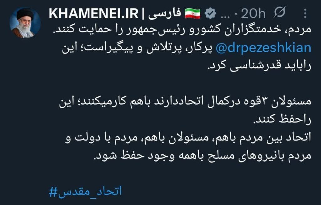 در این توئیت آمده است: مردم، خدمتگزاران کشور و رئیسجمهور را حمایت کنند. رئیسجمهور پرکار، پرتلاش و پیگیر است؛ این را باید قدرشناسی کرد. مسئولان ۳ قوه در کمال اتحاد دارند با هم کار میکنند؛ این را حفظ کنند. اتحاد بین مردم با هم، مسئولان باهم، مردم با دولت و مردم با نیروهای مسلح با همه وجود حفظ شود.