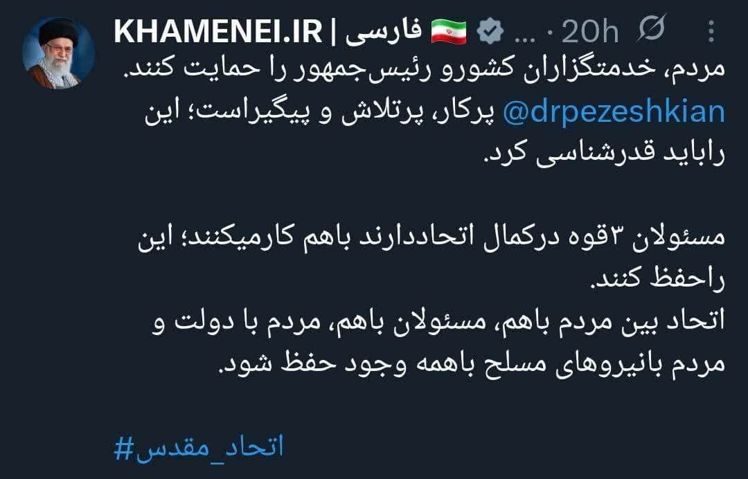 در این توئیت آمده است: مردم، خدمتگزاران کشور و رئیسجمهور را حمایت کنند. رئیسجمهور پرکار، پرتلاش و پیگیر است؛ این را باید قدرشناسی کرد. مسئولان ۳ قوه در کمال اتحاد دارند با هم کار میکنند؛ این را حفظ کنند. اتحاد بین مردم با هم، مسئولان باهم، مردم با دولت و مردم با نیروهای مسلح با همه وجود حفظ شود.