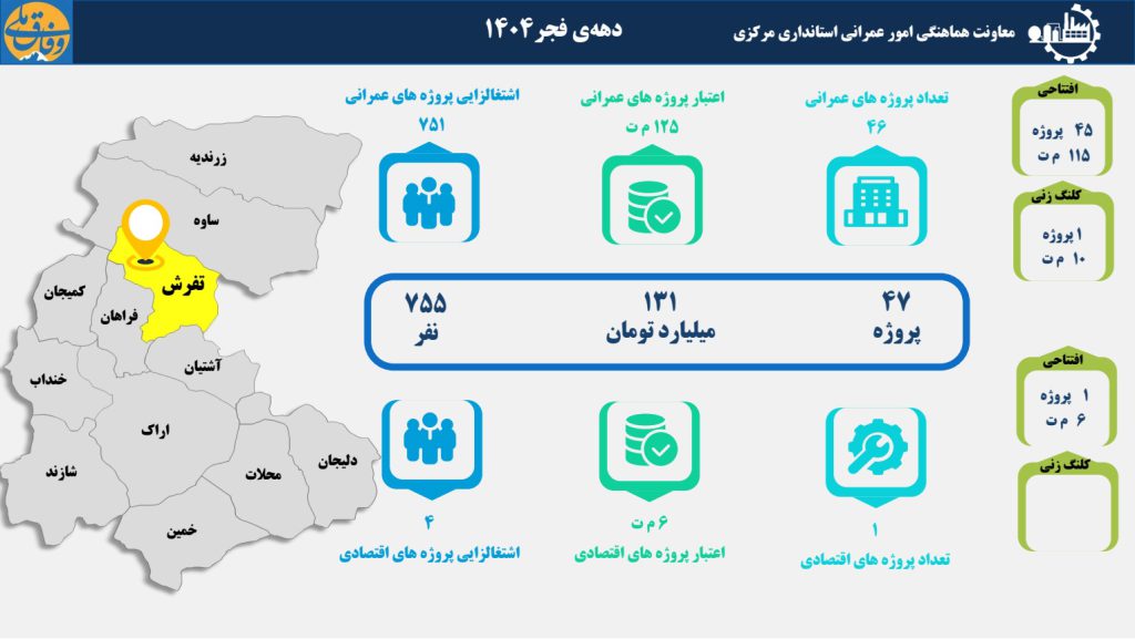 به گزارش پایگاه خبری تحلیلی «ندای تفرش»؛ عبدالرضا میقانی در تشریح برنامه‌های دهه فجر، از افتتاح و کلنگ زنی پروژه‌های عمرانی و اقتصادی در این ایام خبر داد و گفت: در جریان دهه فجر امسال، مجموعاً ۴۷ پروژه عمرانی و اقتصادی با اعتبار کل ۱۳۱ میلیارد تومان به مرحله افتتاح و کلنگ‌زنی خواهد رسید.