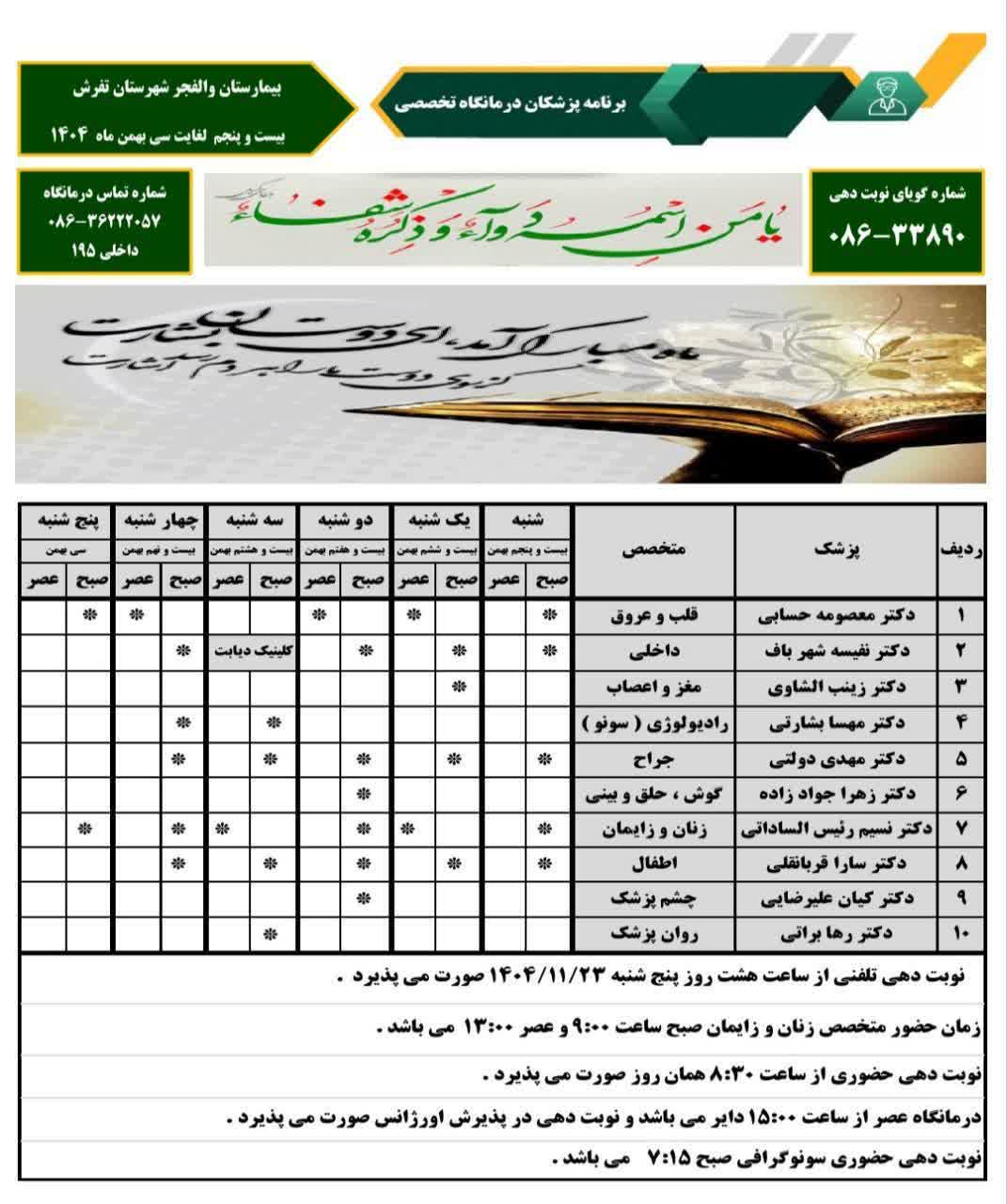 برنامه پزشک های متخصص درمانگاه بیمارستان والفجر شهرستان تفرش